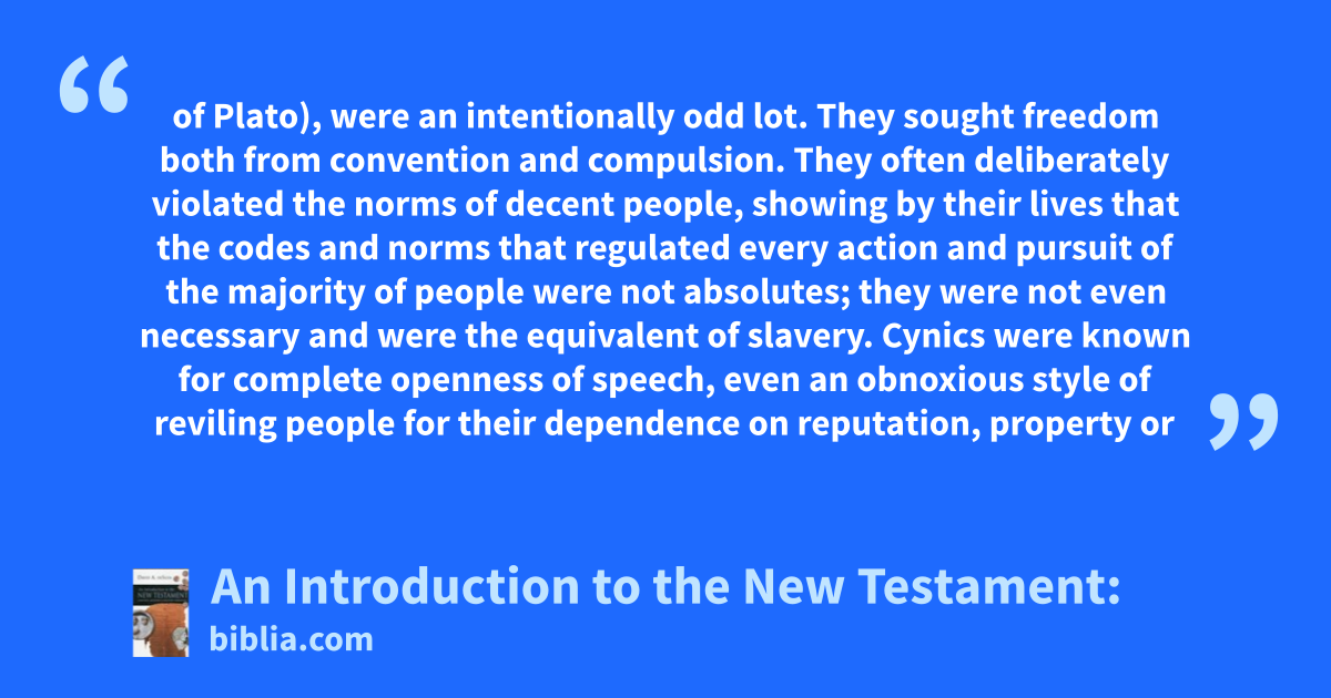 of Plato), were an intentionally odd lot. They sought freedom both from convention and compulsion. They often deliberately violated the norms of decent people, showing by their lives that the codes and norms that regulated every action and pursuit of the majority of people were not absolutes; they were not even necessary and were the equivalent of slavery. Cynics were known for complete openness of speech, even an obnoxious style of reviling people for their dependence on reputation, property or
