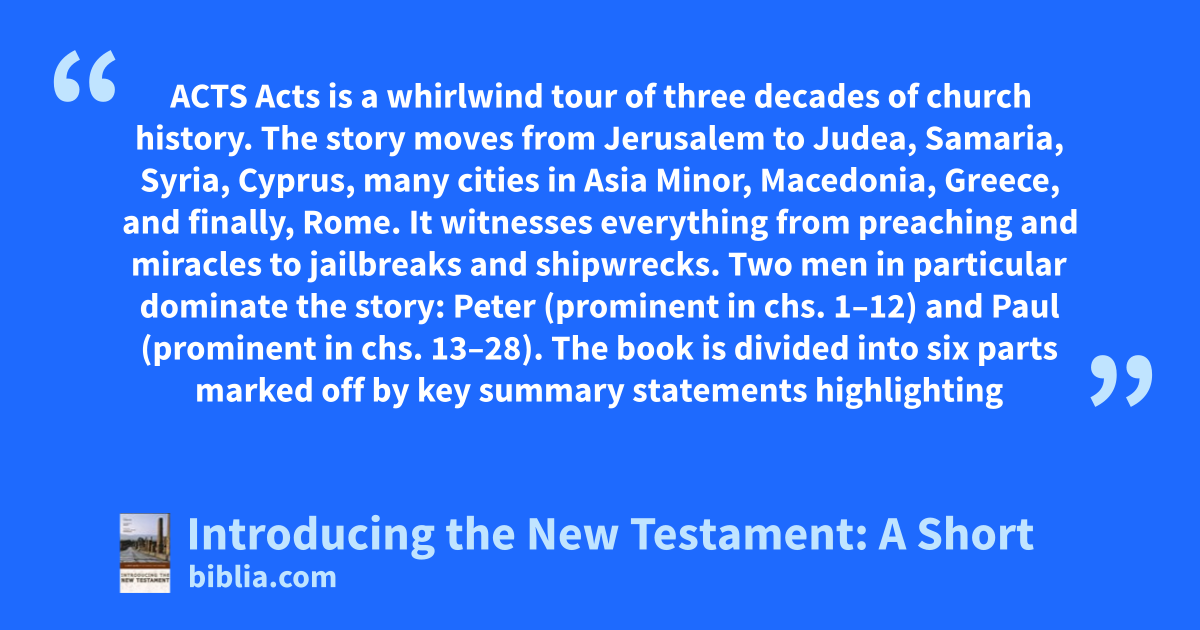 ACTS Acts is a whirlwind tour of three decades of church history. The story moves from Jerusalem to Judea, Samaria, Syria, Cyprus, many cities in Asia Minor, Macedonia, Greece, and finally, Rome. It witnesses everything from preaching and miracles to jailbreaks and shipwrecks. Two men in particular dominate the story: Peter (prominent in chs. 1–12) and Paul (prominent in chs. 13–28). The book is divided into six parts marked off by key summary statements highlighting