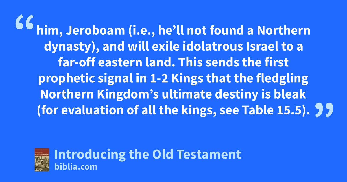 him, Jeroboam (i.e., he’ll not found a Northern dynasty), and will exile idolatrous Israel to a far-off eastern land. This sends the first prophetic signal in 1-2 Kings that the fledgling Northern Kingdom’s ultimate destiny is bleak (for evaluation of all the kings, see Table 15.5).