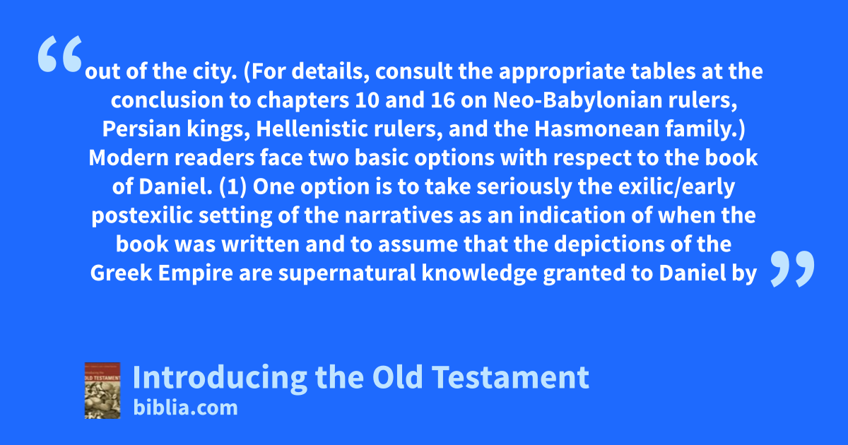 out of the city. (For details, consult the appropriate tables at the conclusion to chapters 10 and 16 on Neo-Babylonian rulers, Persian kings, Hellenistic rulers, and the Hasmonean family.) Modern readers face two basic options with respect to the book of Daniel. (1) One option is to take seriously the exilic/early postexilic setting of the narratives as an indication of when the book was written and to assume that the depictions of the Greek Empire are supernatural knowledge granted to Daniel by