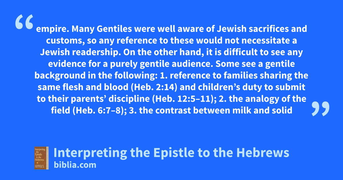 empire. Many Gentiles were well aware of Jewish sacrifices and customs, so any reference to these would not necessitate a Jewish readership. On the other hand, it is difficult to see any evidence for a purely gentile audience. Some see a gentile background in the following: 1. reference to families sharing the same flesh and blood (Heb. 2:14) and children’s duty to submit to their parents’ discipline (Heb. 12:5–11); 2. the analogy of the field (Heb. 6:7–8); 3. the contrast between milk and solid