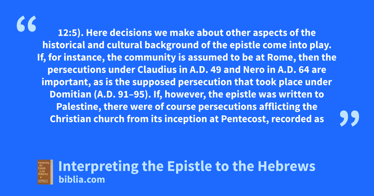 12:5). Here decisions we make about other aspects of the historical and cultural background of the epistle come into play. If, for instance, the community is assumed to be at Rome, then the persecutions under Claudius in A.D. 49 and Nero in A.D. 64 are important, as is the supposed persecution that took place under Domitian (A.D. 91–95). If, however, the epistle was written to Palestine, there were of course persecutions afflicting the Christian church from its inception at Pentecost, recorded as