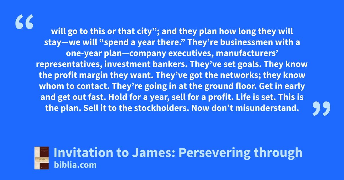 will go to this or that city”; and they plan how long they will stay—we will “spend a year there.” They’re businessmen with a one-year plan—company executives, manufacturers’ representatives, investment bankers. They’ve set goals. They know the profit margin they want. They’ve got the networks; they know whom to contact. They’re going in at the ground floor. Get in early and get out fast. Hold for a year, sell for a profit. Life is set. This is the plan. Sell it to the stockholders. Now don’t misunderstand.