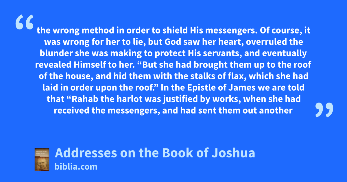 the wrong method in order to shield His messengers. Of course, it was wrong for her to lie, but God saw her heart, overruled the blunder she was making to protect His servants, and eventually revealed Himself to her. “But she had brought them up to the roof of the house, and hid them with the stalks of flax, which she had laid in order upon the roof.” In the Epistle of James we are told that “Rahab the harlot was justified by works, when she had received the messengers, and had sent them out another