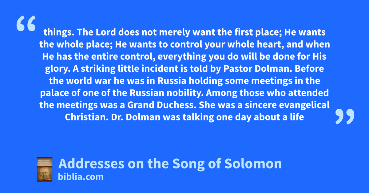 things. The Lord does not merely want the first place; He wants the whole place; He wants to control your whole heart, and when He has the entire control, everything you do will be done for His glory. A striking little incident is told by Pastor Dolman. Before the world war he was in Russia holding some meetings in the palace of one of the Russian nobility. Among those who attended the meetings was a Grand Duchess. She was a sincere evangelical Christian. Dr. Dolman was talking one day about a life
