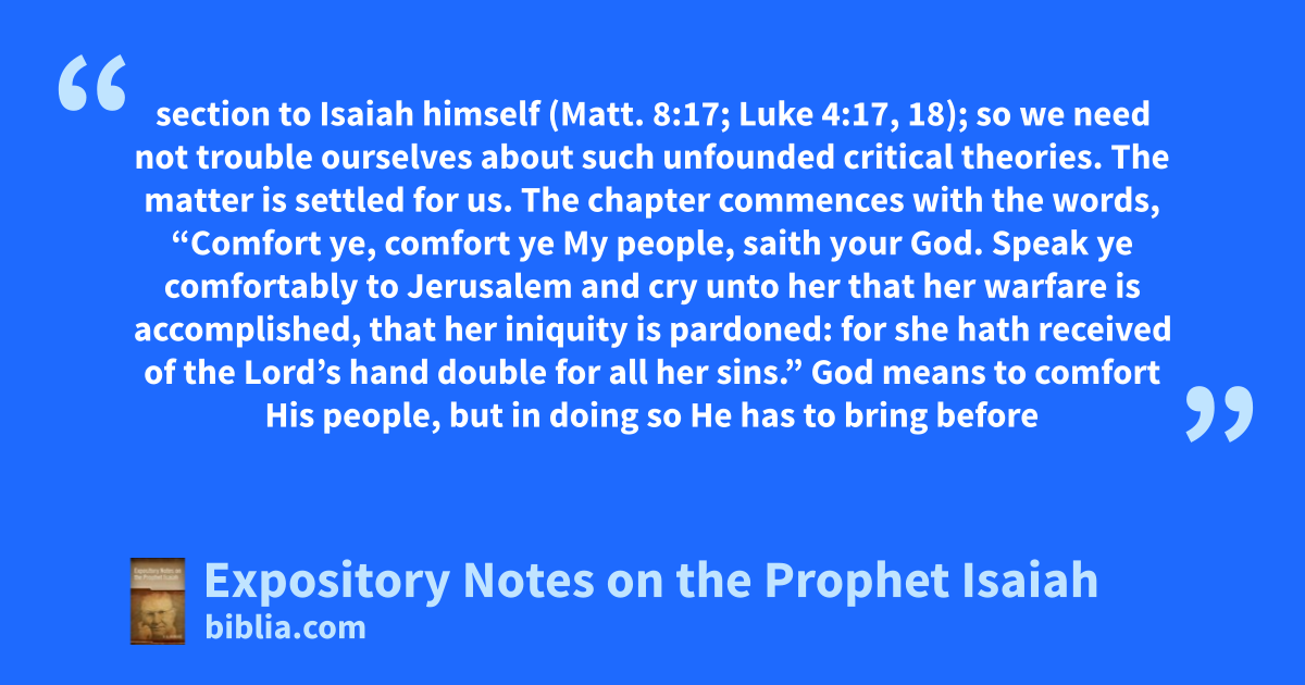 section to Isaiah himself (Matt. 8:17; Luke 4:17, 18); so we need not trouble ourselves about such unfounded critical theories. The matter is settled for us. The chapter commences with the words, “Comfort ye, comfort ye My people, saith your God. Speak ye comfortably to Jerusalem and cry unto her that her warfare is accomplished, that her iniquity is pardoned: for she hath received of the Lord’s hand double for all her sins.” God means to comfort His people, but in doing so He has to bring before