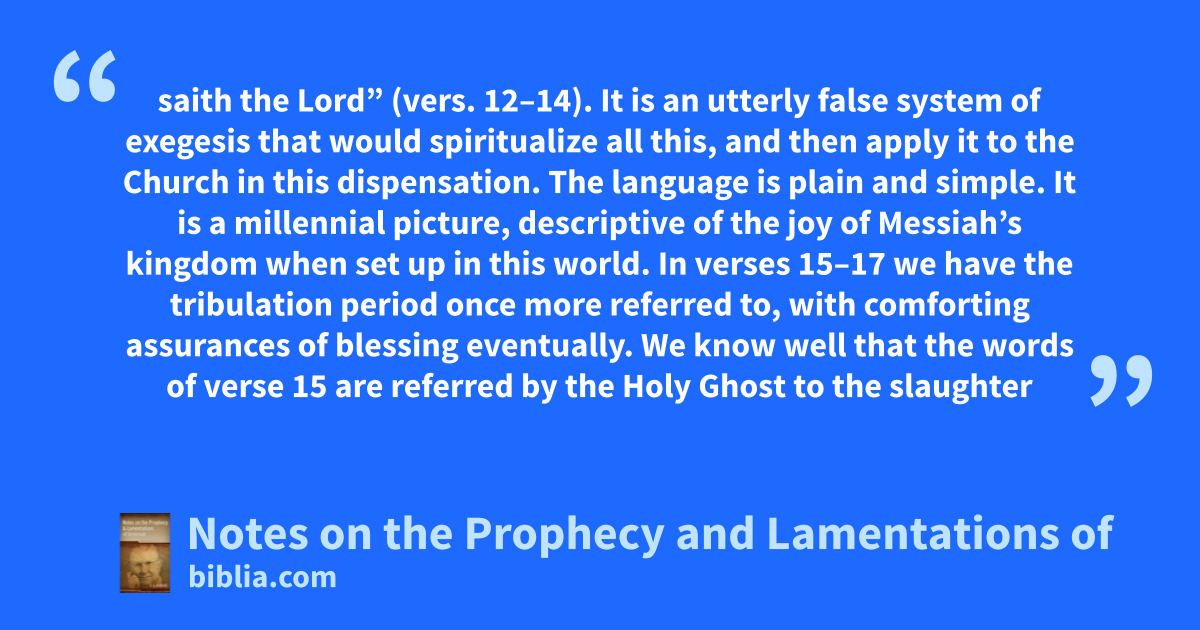 saith the Lord” (vers. 12–14). It is an utterly false system of exegesis that would spiritualize all this, and then apply it to the Church in this dispensation. The language is plain and simple. It is a millennial picture, descriptive of the joy of Messiah’s kingdom when set up in this world. In verses 15–17 we have the tribulation period once more referred to, with comforting assurances of blessing eventually. We know well that the words of verse 15 are referred by the Holy Ghost to the slaughter