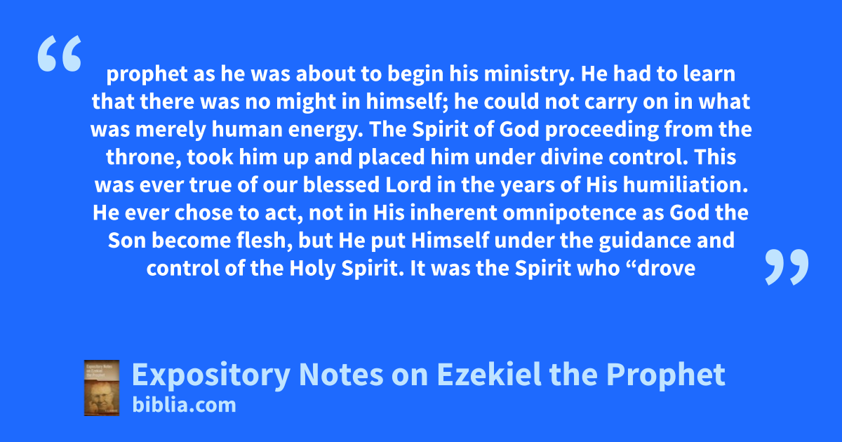 prophet as he was about to begin his ministry. He had to learn that there was no might in himself; he could not carry on in what was merely human energy. The Spirit of God proceeding from the throne, took him up and placed him under divine control. This was ever true of our blessed Lord in the years of His humiliation. He ever chose to act, not in His inherent omnipotence as God the Son become flesh, but He put Himself under the guidance and control of the Holy Spirit. It was the Spirit who “drove