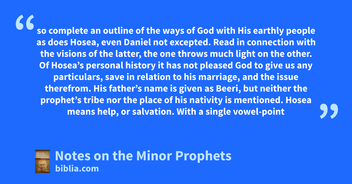 so complete an outline of the ways of God with His earthly people as does Hosea, even Daniel not excepted. Read in connection with the visions of the latter, the one throws much light on the other. Of Hosea’s personal history it has not pleased God to give us any particulars, save in relation to his marriage, and the issue therefrom. His father’s name is given as Beeri, but neither the prophet’s tribe nor the place of his nativity is mentioned. Hosea means help, or salvation. With a single vowel-point