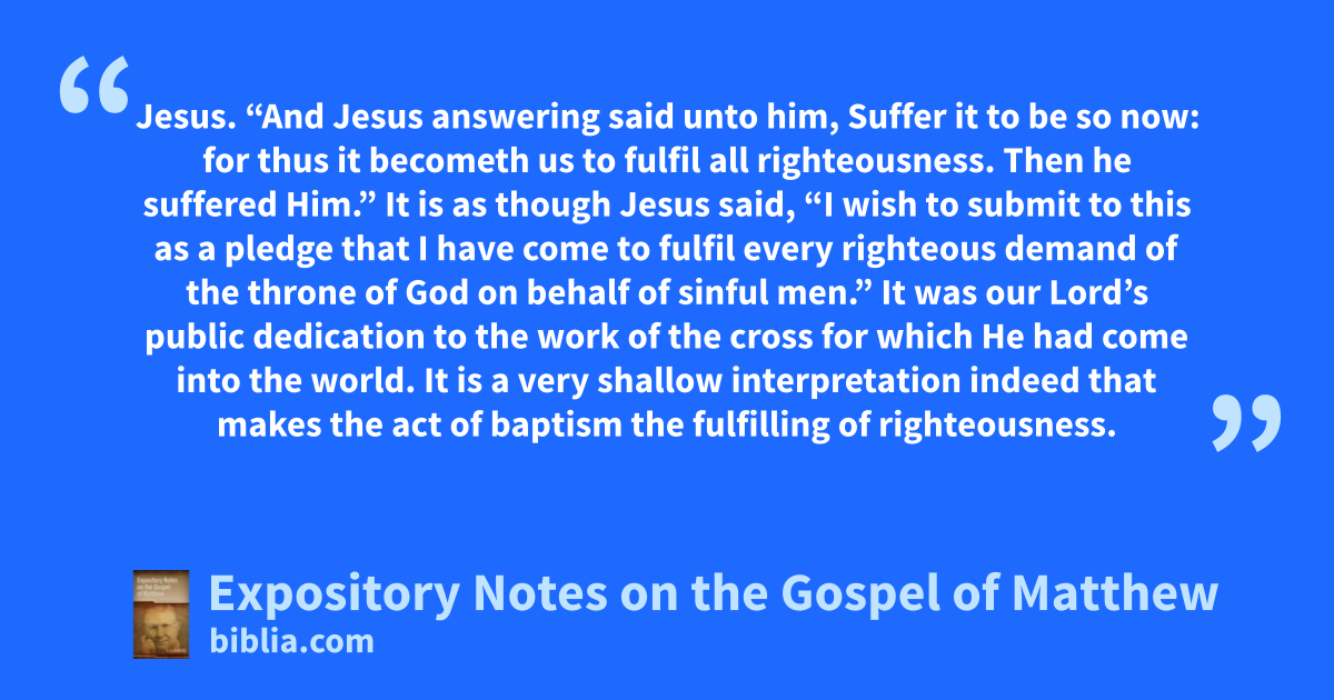 Jesus. “And Jesus answering said unto him, Suffer it to be so now: for thus it becometh us to fulfil all righteousness. Then he suffered Him.” It is as though Jesus said, “I wish to submit to this as a pledge that I have come to fulfil every righteous demand of the throne of God on behalf of sinful men.” It was our Lord’s public dedication to the work of the cross for which He had come into the world. It is a very shallow interpretation indeed that makes the act of baptism the fulfilling of righteousness.