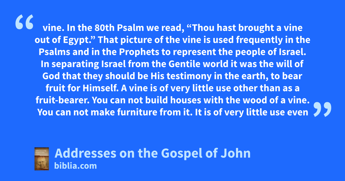 vine. In the 80th Psalm we read, “Thou hast brought a vine out of Egypt.” That picture of the vine is used frequently in the Psalms and in the Prophets to represent the people of Israel. In separating Israel from the Gentile world it was the will of God that they should be His testimony in the earth, to bear fruit for Himself. A vine is of very little use other than as a fruit-bearer. You can not build houses with the wood of a vine. You can not make furniture from it. It is of very little use even