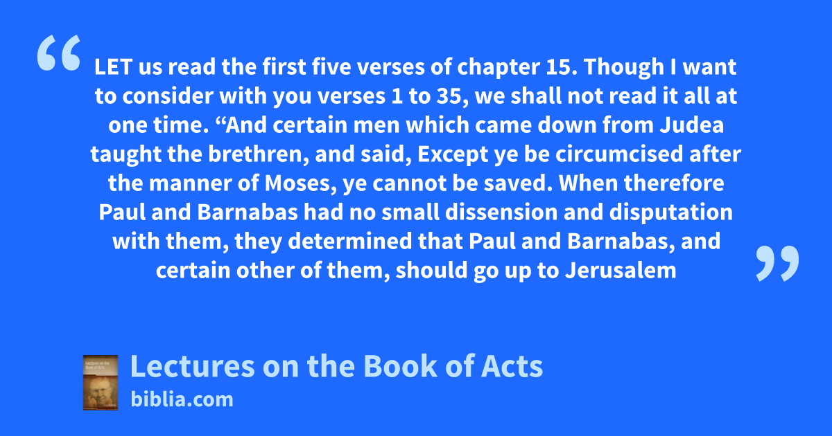LET us read the first five verses of chapter 15. Though I want to consider with you verses 1 to 35, we shall not read it all at one time. “And certain men which came down from Judea taught the brethren, and said, Except ye be circumcised after the manner of Moses, ye cannot be saved. When therefore Paul and Barnabas had no small dissension and disputation with them, they determined that Paul and Barnabas, and certain other of them, should go up to Jerusalem