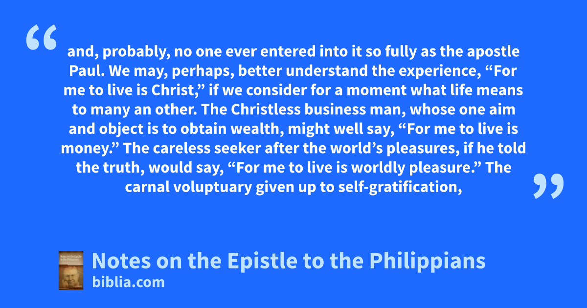 and, probably, no one ever entered into it so fully as the apostle Paul. We may, perhaps, better understand the experience, “For me to live is Christ,” if we consider for a moment what life means to many an other. The Christless business man, whose one aim and object is to obtain wealth, might well say, “For me to live is money.” The careless seeker after the world’s pleasures, if he told the truth, would say, “For me to live is worldly pleasure.” The carnal voluptuary given up to self-gratification,