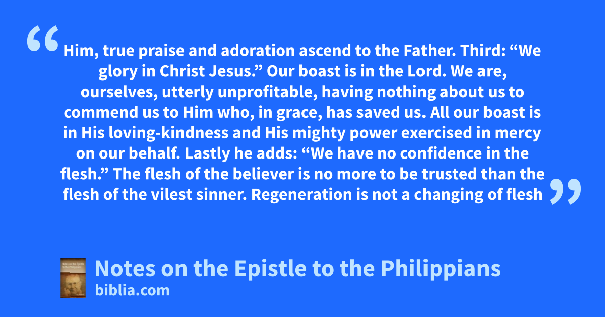 Him, true praise and adoration ascend to the Father. Third: “We glory in Christ Jesus.” Our boast is in the Lord. We are, ourselves, utterly unprofitable, having nothing about us to commend us to Him who, in grace, has saved us. All our boast is in His loving-kindness and His mighty power exercised in mercy on our behalf. Lastly he adds: “We have no confidence in the flesh.” The flesh of the believer is no more to be trusted than the flesh of the vilest sinner. Regeneration is not a changing of flesh