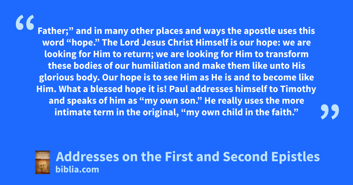 Father;” and in many other places and ways the apostle uses this word “hope.” The Lord Jesus Christ Himself is our hope: we are looking for Him to return; we are looking for Him to transform these bodies of our humiliation and make them like unto His glorious body. Our hope is to see Him as He is and to become like Him. What a blessed hope it is! Paul addresses himself to Timothy and speaks of him as “my own son.” He really uses the more intimate term in the original, “my own child in the faith.”