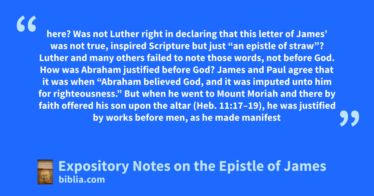 here? Was not Luther right in declaring that this letter of James’ was not true, inspired Scripture but just “an epistle of straw”? Luther and many others failed to note those words, not before God. How was Abraham justified before God? James and Paul agree that it was when “Abraham believed God, and it was imputed unto him for righteousness.” But when he went to Mount Moriah and there by faith offered his son upon the altar (Heb. 11:17–19), he was justified by works before men, as he made manifest