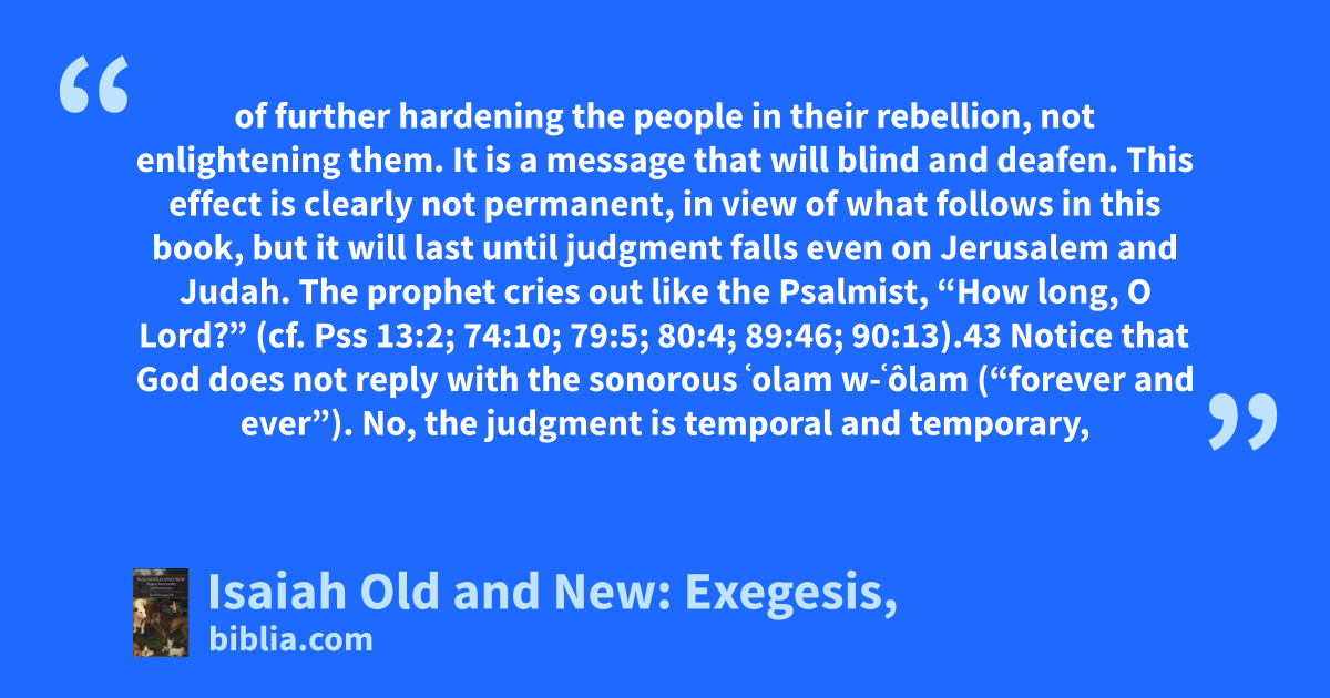 of further hardening the people in their rebellion, not enlightening them. It is a message that will blind and deafen. This effect is clearly not permanent, in view of what follows in this book, but it will last until judgment falls even on Jerusalem and Judah. The prophet cries out like the Psalmist, “How long, O Lord?” (cf. Pss 13:2; 74:10; 79:5; 80:4; 89:46; 90:13).43 Notice that God does not reply with the sonorous ʿolam w-ʿôlam (“forever and ever”). No, the judgment is temporal and temporary,