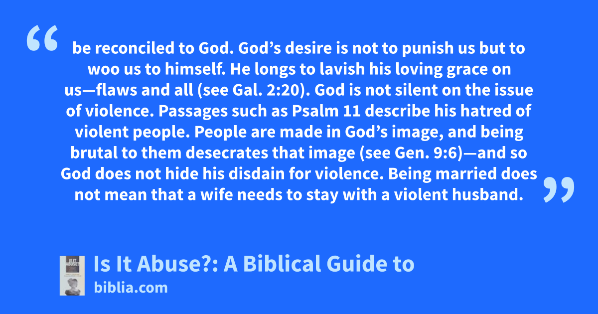 be reconciled to God. God’s desire is not to punish us but to woo us to himself. He longs to lavish his loving grace on us—flaws and all (see Gal. 2:20). God is not silent on the issue of violence. Passages such as Psalm 11 describe his hatred of violent people. People are made in God’s image, and being brutal to them desecrates that image (see Gen. 9:6)—and so God does not hide his disdain for violence. Being married does not mean that a wife needs to stay with a violent husband.