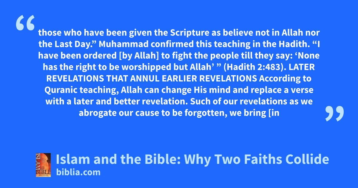 those who have been given the Scripture as believe not in Allah nor the Last Day.” Muhammad confirmed this teaching in the Hadith. “I have been ordered [by Allah] to fight the people till they say: ‘None has the right to be worshipped but Allah’ ” (Hadith 2:483). LATER REVELATIONS THAT ANNUL EARLIER REVELATIONS According to Quranic teaching, Allah can change His mind and replace a verse with a later and better revelation. Such of our revelations as we abrogate our cause to be forgotten, we bring [in