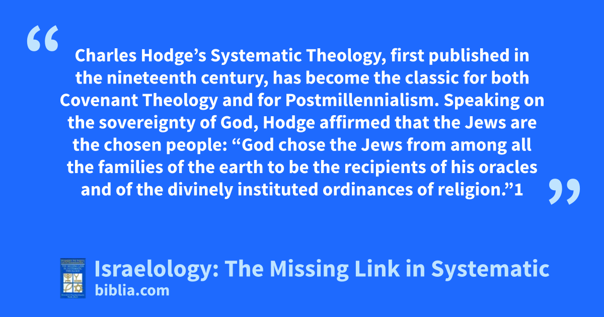 Charles Hodge’s Systematic Theology, first published in the nineteenth century, has become the classic for both Covenant Theology and for Postmillennialism. Speaking on the sovereignty of God, Hodge affirmed that the Jews are the chosen people: “God chose the Jews from among all the families of the earth to be the recipients of his oracles and of the divinely instituted ordinances of religion.”1