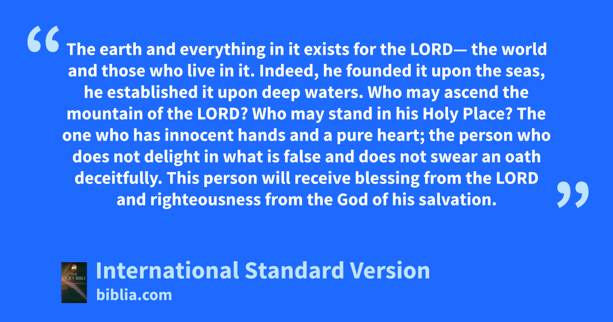 The earth and everything in it exists for the LORD— the world and those who live in it. Indeed, he founded it upon the seas, he established it upon deep waters. Who may ascend the mountain of the LORD? Who may stand in his Holy Place? The one who has innocent hands and a pure heart; the person who does not delight in what is false and does not swear an oath deceitfully. This person will receive blessing from the LORD and righteousness from the God of his salvation.