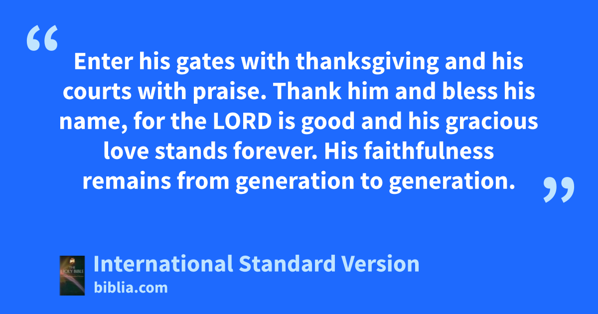 Enter his gates with thanksgiving and his courts with praise. Thank him and bless his name, for the LORD is good and his gracious love stands forever. His faithfulness remains from generation to generation.