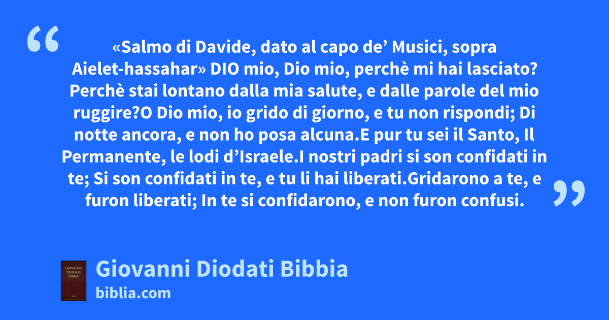 22 1«Salmo di Davide, dato al capo de’ Musici, sopra Aielet-hassahar» DIO mio, Dio mio, perchè mi hai lasciato? Perchè stai lontano dalla mia salute, e dalle parole del mio ruggire? 2O Dio mio, io grido di giorno, e tu non rispondi; Di notte ancora, e non ho posa alcuna. 3E pur tu sei il Santo, Il Permanente, le lodi d’Israele. 4I nostri padri si son confidati in te; Si son confidati in te, e tu li hai liberati. 5Gridarono a te, e furon liberati; In te si confidarono, e non furon confusi. 6Ma io sono un verme, e non un uomo; Il vituperio degli uomini, e lo sprezzato fra il popolo. 7Chiunque mi vede, si beffa di me, Mi stende il labbro, e scuote il capo; 8Dicendo: Egli si rimette nel Signore; liberilo dunque; Riscuotalo, poichè egli lo gradisce. 9Certo, tu sei quel che mi hai tratto fuor del seno; Tu mi hai affidato da che io era alle mammelle di mia madre. 10Io fui gettato sopra te dalla matrice; Tu sei il mio Dio fin dal seno di mia madre.