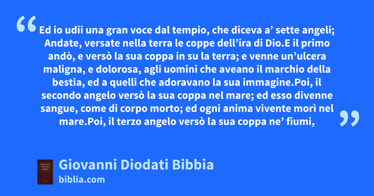 16 1Ed io udii una gran voce dal tempio, che diceva a’ sette angeli; Andate, versate nella terra le coppe dell’ira di Dio. 2E il primo andò, e versò la sua coppa in su la terra; e venne un’ulcera maligna, e dolorosa, agli uomini che aveano il marchio della bestia, ed a quelli che adoravano la sua immagine. 3Poi, il secondo angelo versò la sua coppa nel mare; ed esso divenne sangue, come di corpo morto; ed ogni anima vivente morì nel mare. 4Poi, il terzo angelo versò la sua coppa ne’ fiumi, e nelle fonti dell’acque; e divennero sangue. 5Ed io udii l’angelo delle acque, che diceva: Tu sei giusto, o Signore, che sei, e che eri, che sei il Santo, d’aver fatti questi giudicii. 6Poichè essi hanno sparso il sangue de’ santi, e de’ profeti, tu hai loro altresì dato a bere del sangue; perciocchè ben ne son degni. 7Ed io ne udii un altro, dal lato dell’altare, che diceva: Sì certo, Signore Iddio onnipotente, i tuoi giudicii son veraci, e giusti.