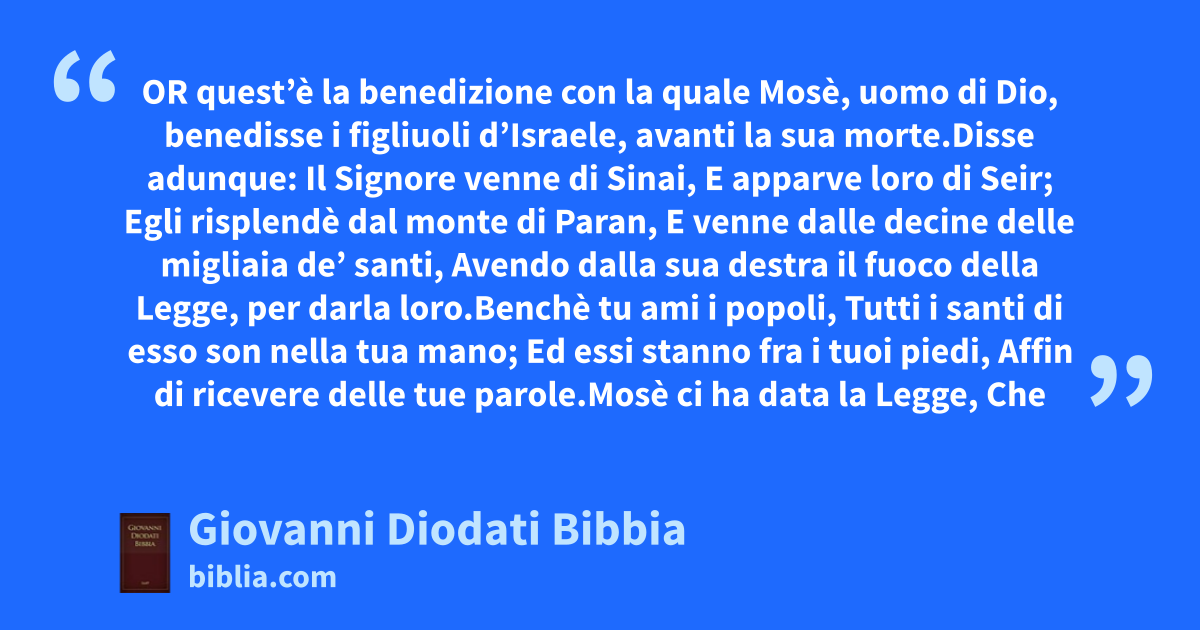 33 1OR quest’è la benedizione con la quale Mosè, uomo di Dio, benedisse i figliuoli d’Israele, avanti la sua morte. 2Disse adunque: Il Signore venne di Sinai, E apparve loro di Seir; Egli risplendè dal monte di Paran, E venne dalle decine delle migliaia de’ santi, Avendo dalla sua destra il fuoco della Legge, per darla loro. 3Benchè tu ami i popoli, Tutti i santi di esso son nella tua mano; Ed essi stanno fra i tuoi piedi, Affin di ricevere delle tue parole. 4Mosè ci ha data la Legge, Che è una eredità alla raunanza di Giacobbe. 5Ed egli è stato Re in Iesurun, Quando si raunavano i Capi del popolo, Insieme con le tribù d’Israele.