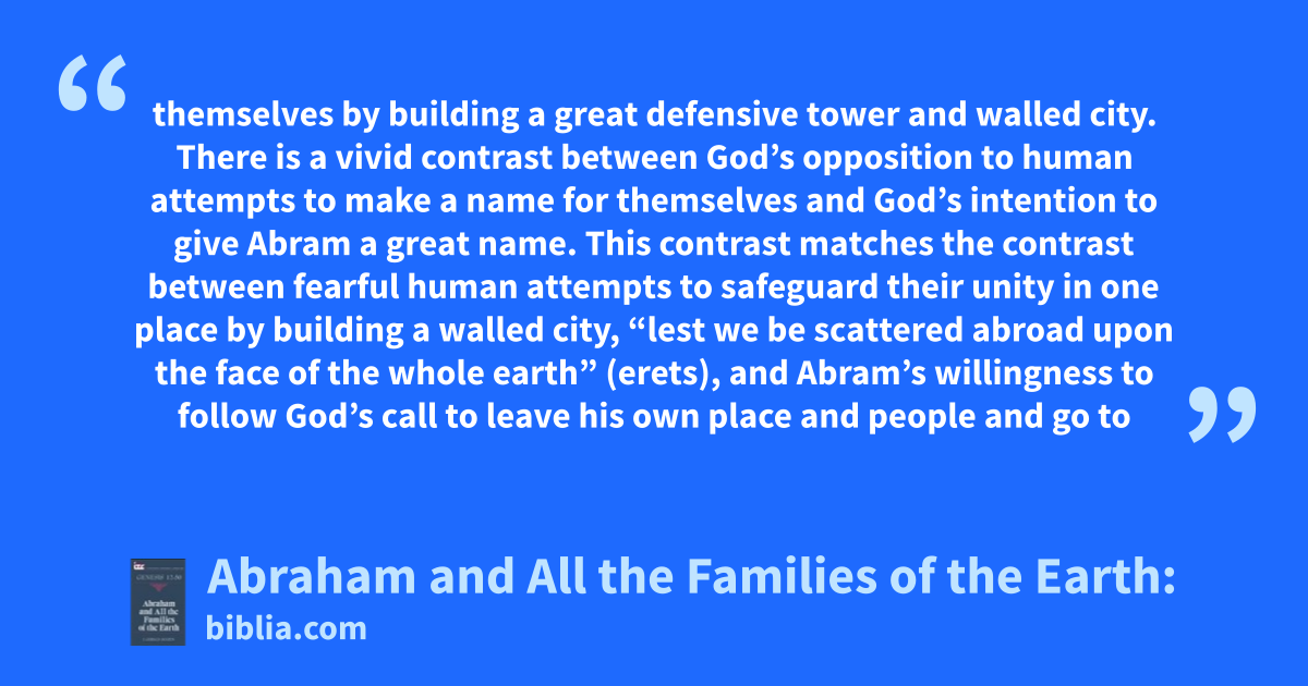 themselves by building a great defensive tower and walled city. There is a vivid contrast between God’s opposition to human attempts to make a name for themselves and God’s intention to give Abram a great name. This contrast matches the contrast between fearful human attempts to safeguard their unity in one place by building a walled city, “lest we be scattered abroad upon the face of the whole earth” (erets), and Abram’s willingness to follow God’s call to leave his own place and people and go to
