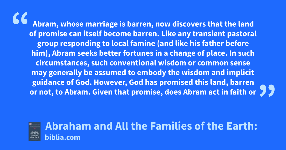 Abram, whose marriage is barren, now discovers that the land of promise can itself become barren. Like any transient pastoral group responding to local famine (and like his father before him), Abram seeks better fortunes in a change of place. In such circumstances, such conventional wisdom or common sense may generally be assumed to embody the wisdom and implicit guidance of God. However, God has promised this land, barren or not, to Abram. Given that promise, does Abram act in faith or