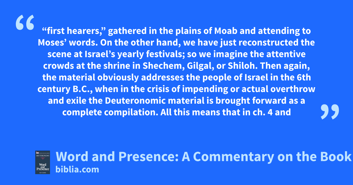 “first hearers,” gathered in the plains of Moab and attending to Moses’ words. On the other hand, we have just reconstructed the scene at Israel’s yearly festivals; so we imagine the attentive crowds at the shrine in Shechem, Gilgal, or Shiloh. Then again, the material obviously addresses the people of Israel in the 6th century B.C., when in the crisis of impending or actual overthrow and exile the Deuteronomic material is brought forward as a complete compilation. All this means that in ch. 4 and