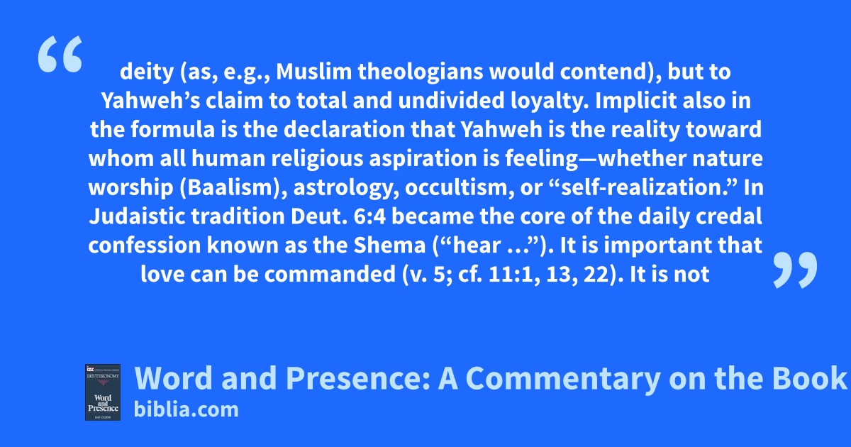 deity (as, e.g., Muslim theologians would contend), but to Yahweh’s claim to total and undivided loyalty. Implicit also in the formula is the declaration that Yahweh is the reality toward whom all human religious aspiration is feeling—whether nature worship (Baalism), astrology, occultism, or “self-realization.” In Judaistic tradition Deut. 6:4 became the core of the daily credal confession known as the Shema (“hear …”). It is important that love can be commanded (v. 5; cf. 11:1, 13, 22). It is not