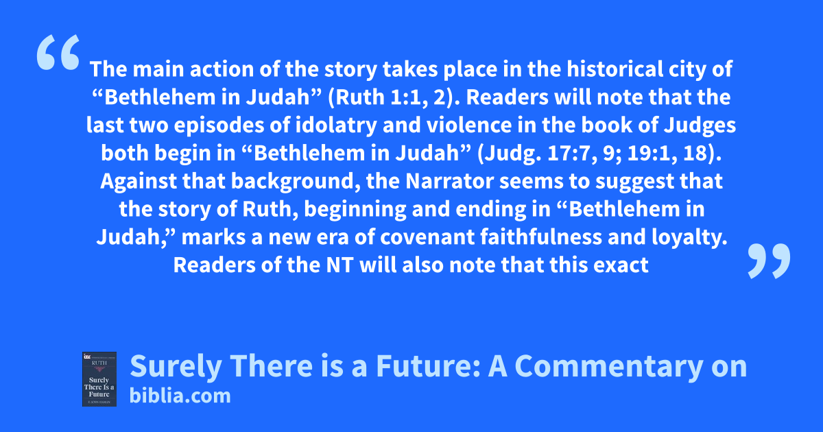 The main action of the story takes place in the historical city of “Bethlehem in Judah” (Ruth 1:1, 2). Readers will note that the last two episodes of idolatry and violence in the book of Judges both begin in “Bethlehem in Judah” (Judg. 17:7, 9; 19:1, 18). Against that background, the Narrator seems to suggest that the story of Ruth, beginning and ending in “Bethlehem in Judah,” marks a new era of covenant faithfulness and loyalty. Readers of the NT will also note that this exact