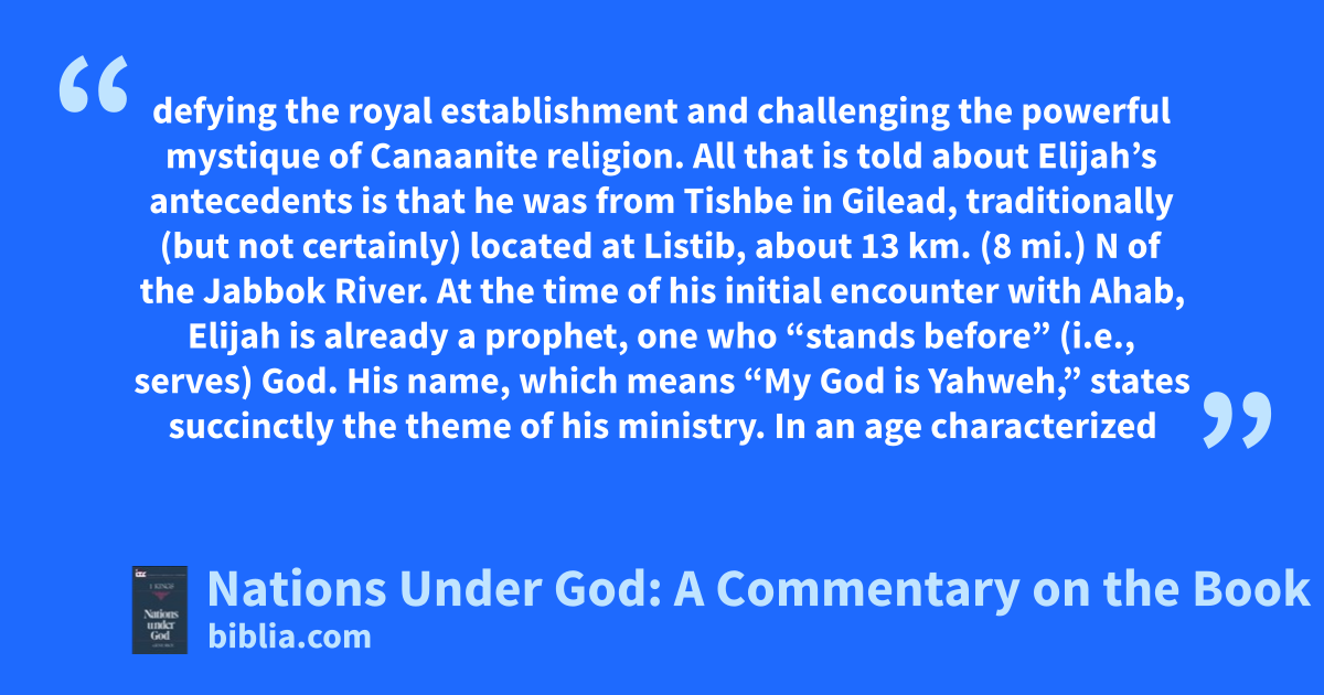 defying the royal establishment and challenging the powerful mystique of Canaanite religion. All that is told about Elijah’s antecedents is that he was from Tishbe in Gilead, traditionally (but not certainly) located at Listib, about 13 km. (8 mi.) N of the Jabbok River. At the time of his initial encounter with Ahab, Elijah is already a prophet, one who “stands before” (i.e., serves) God. His name, which means “My God is Yahweh,” states succinctly the theme of his ministry. In an age characterized
