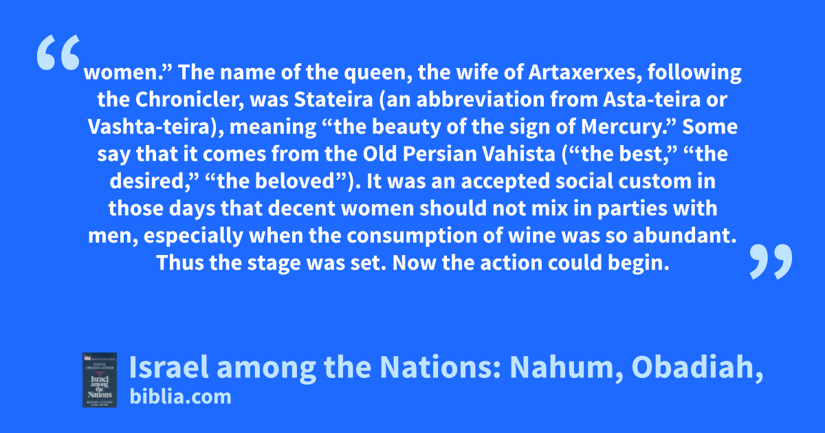 women.” The name of the queen, the wife of Artaxerxes, following the Chronicler, was Stateira (an abbreviation from Asta-teira or Vashta-teira), meaning “the beauty of the sign of Mercury.” Some say that it comes from the Old Persian Vahista (“the best,” “the desired,” “the beloved”). It was an accepted social custom in those days that decent women should not mix in parties with men, especially when the consumption of wine was so abundant. Thus the stage was set. Now the action could begin.