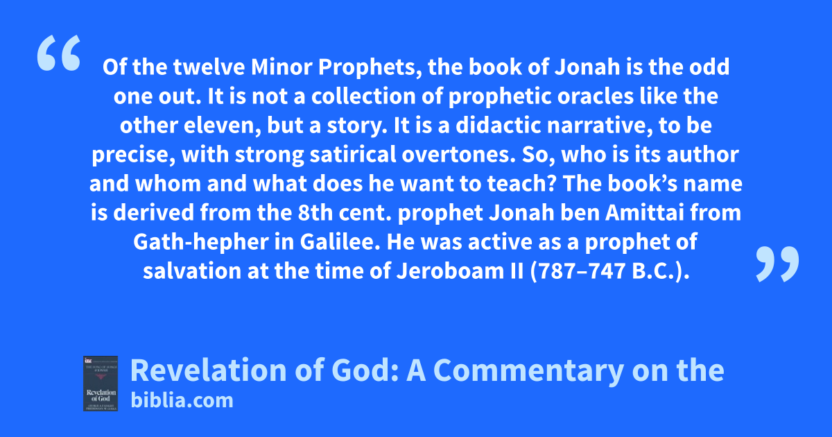 Of the twelve Minor Prophets, the book of Jonah is the odd one out. It is not a collection of prophetic oracles like the other eleven, but a story. It is a didactic narrative, to be precise, with strong satirical overtones. So, who is its author and whom and what does he want to teach? The book’s name is derived from the 8th cent. prophet Jonah ben Amittai from Gath-hepher in Galilee. He was active as a prophet of salvation at the time of Jeroboam II (787–747 B.C.).