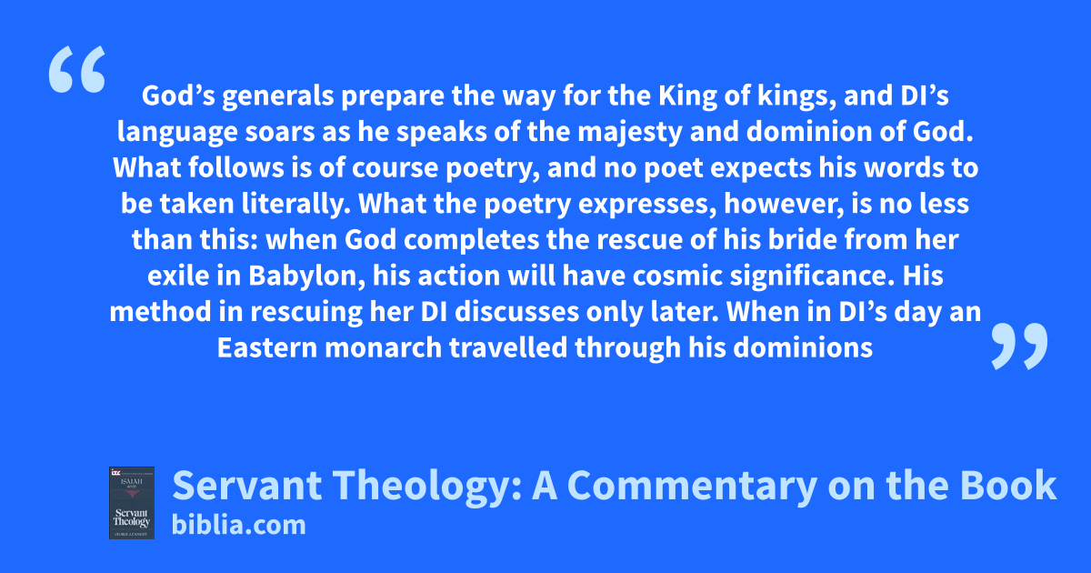 God’s generals prepare the way for the King of kings, and DI’s language soars as he speaks of the majesty and dominion of God. What follows is of course poetry, and no poet expects his words to be taken literally. What the poetry expresses, however, is no less than this: when God completes the rescue of his bride from her exile in Babylon, his action will have cosmic significance. His method in rescuing her DI discusses only later. When in DI’s day an Eastern monarch travelled through his dominions