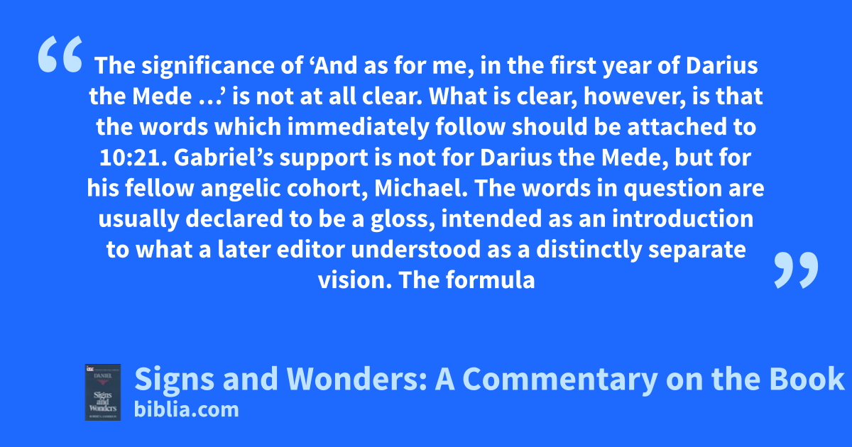 The significance of ‘And as for me, in the first year of Darius the Mede …’ is not at all clear. What is clear, however, is that the words which immediately follow should be attached to 10:21. Gabriel’s support is not for Darius the Mede, but for his fellow angelic cohort, Michael. The words in question are usually declared to be a gloss, intended as an introduction to what a later editor understood as a distinctly separate vision. The formula
