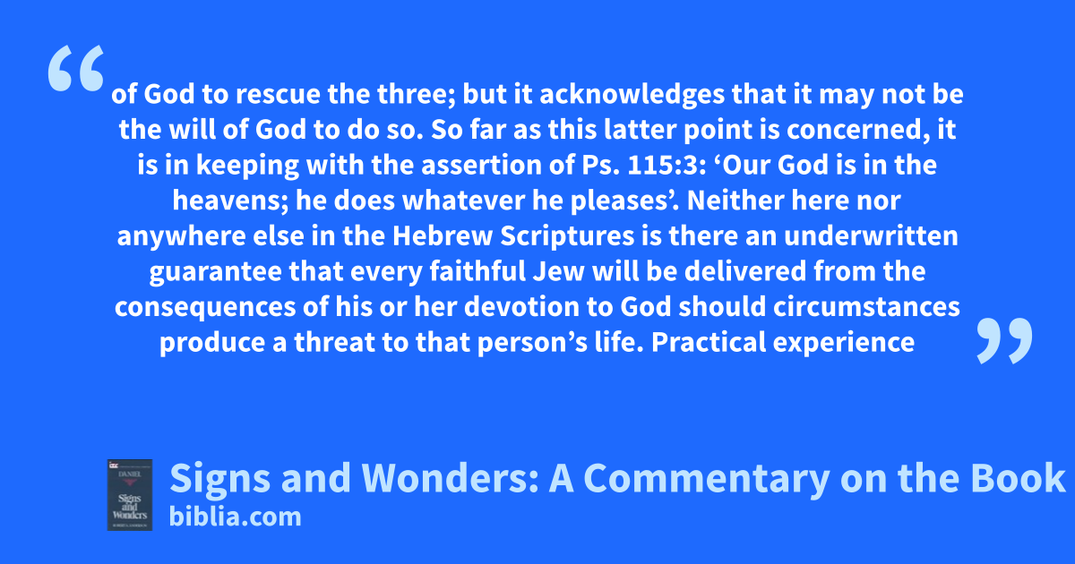 of God to rescue the three; but it acknowledges that it may not be the will of God to do so. So far as this latter point is concerned, it is in keeping with the assertion of Ps. 115:3: ‘Our God is in the heavens; he does whatever he pleases’. Neither here nor anywhere else in the Hebrew Scriptures is there an underwritten guarantee that every faithful Jew will be delivered from the consequences of his or her devotion to God should circumstances produce a threat to that person’s life. Practical experience