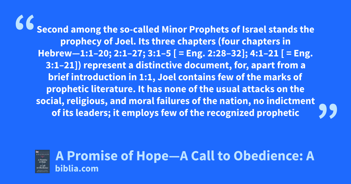Second among the so-called Minor Prophets of Israel stands the prophecy of Joel. Its three chapters (four chapters in Hebrew—1:1–20; 2:1–27; 3:1–5 [ = Eng. 2:28–32]; 4:1–21 [ = Eng. 3:1–21]) represent a distinctive document, for, apart from a brief introduction in 1:1, Joel contains few of the marks of prophetic literature. It has none of the usual attacks on the social, religious, and moral failures of the nation, no indictment of its leaders; it employs few of the recognized prophetic