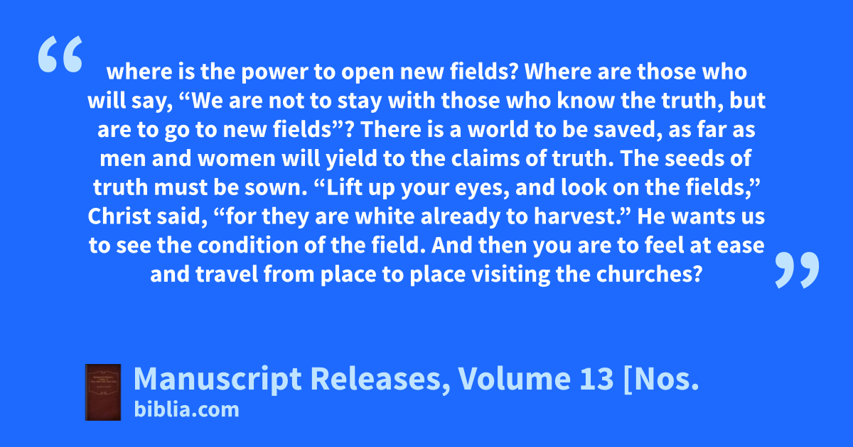 where is the power to open new fields? Where are those who will say, “We are not to stay with those who know the truth, but are to go to new fields”? There is a world to be saved, as far as men and women will yield to the claims of truth. The seeds of truth must be sown. “Lift up your eyes, and look on the fields,” Christ said, “for they are white already to harvest.” He wants us to see the condition of the field. And then you are to feel at ease and travel from place to place visiting the churches?