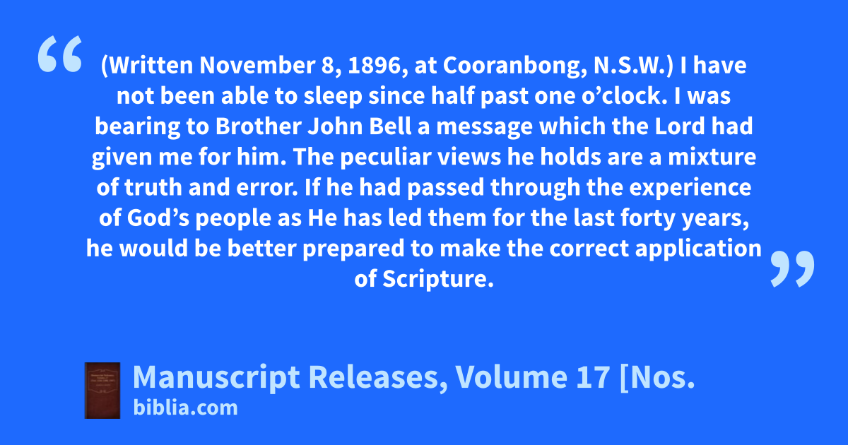 (Written November 8, 1896, at Cooranbong, N.S.W.) I have not been able to sleep since half past one o’clock. I was bearing to Brother John Bell a message which the Lord had given me for him. The peculiar views he holds are a mixture of truth and error. If he had passed through the experience of God’s people as He has led them for the last forty years, he would be better prepared to make the correct application of Scripture.
