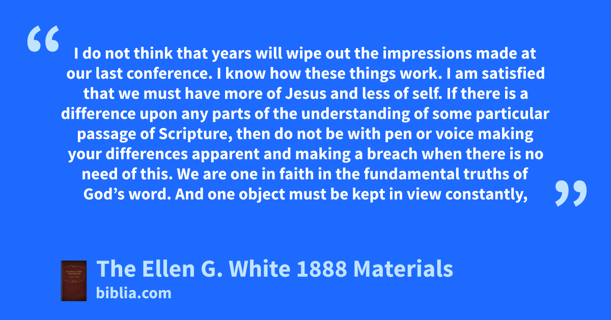 I do not think that years will wipe out the impressions made at our last conference. I know how these things work. I am satisfied that we must have more of Jesus and less of self. If there is a difference upon any parts of the understanding of some particular passage of Scripture, then do not be with pen or voice making your differences apparent and making a breach when there is no need of this. We are one in faith in the fundamental truths of God’s word. And one object must be kept in view constantly,