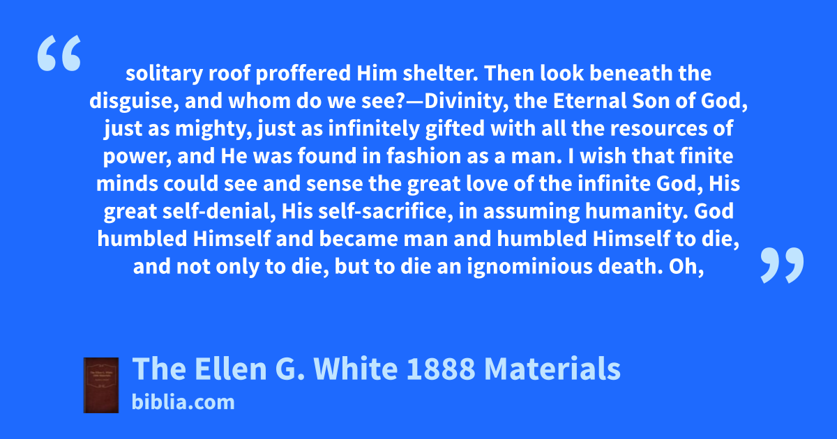 solitary roof proffered Him shelter. Then look beneath the disguise, and whom do we see?—Divinity, the Eternal Son of God, just as mighty, just as infinitely gifted with all the resources of power, and He was found in fashion as a man. I wish that finite minds could see and sense the great love of the infinite God, His great self-denial, His self-sacrifice, in assuming humanity. God humbled Himself and became man and humbled Himself to die, and not only to die, but to die an ignominious death. Oh,