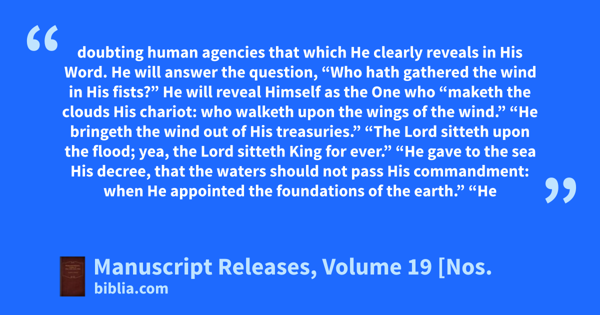 doubting human agencies that which He clearly reveals in His Word. He will answer the question, “Who hath gathered the wind in His fists?” He will reveal Himself as the One who “maketh the clouds His chariot: who walketh upon the wings of the wind.” “He bringeth the wind out of His treasuries.” “The Lord sitteth upon the flood; yea, the Lord sitteth King for ever.” “He gave to the sea His decree, that the waters should not pass His commandment: when He appointed the foundations of the earth.” “He