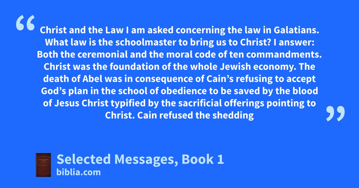 Christ and the Law I am asked concerning the law in Galatians. What law is the schoolmaster to bring us to Christ? I answer: Both the ceremonial and the moral code of ten commandments. Christ was the foundation of the whole Jewish economy. The death of Abel was in consequence of Cain’s refusing to accept God’s plan in the school of obedience to be saved by the blood of Jesus Christ typified by the sacrificial offerings pointing to Christ. Cain refused the shedding