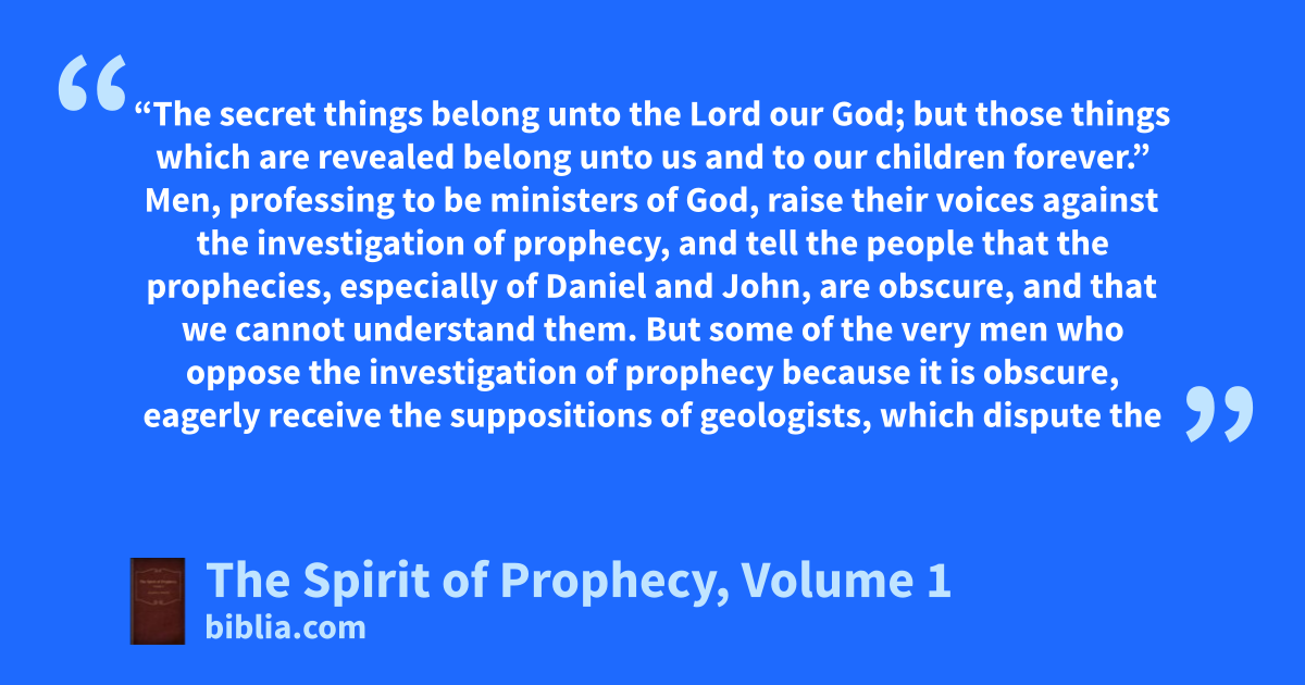 “The secret things belong unto the Lord our God; but those things which are revealed belong unto us and to our children forever.” Men, professing to be ministers of God, raise their voices against the investigation of prophecy, and tell the people that the prophecies, especially of Daniel and John, are obscure, and that we cannot understand them. But some of the very men who oppose the investigation of prophecy because it is obscure, eagerly receive the suppositions of geologists, which dispute the