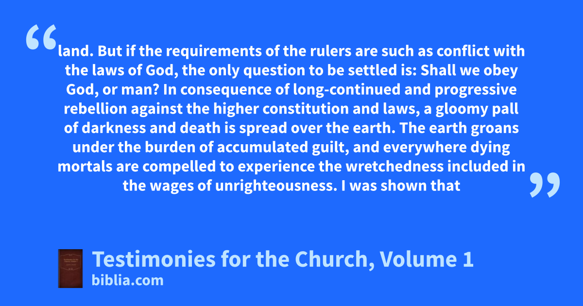 land. But if the requirements of the rulers are such as conflict with the laws of God, the only question to be settled is: Shall we obey God, or man? In consequence of long-continued and progressive rebellion against the higher constitution and laws, a gloomy pall of darkness and death is spread over the earth. The earth groans under the burden of accumulated guilt, and everywhere dying mortals are compelled to experience the wretchedness included in the wages of unrighteousness. I was shown that