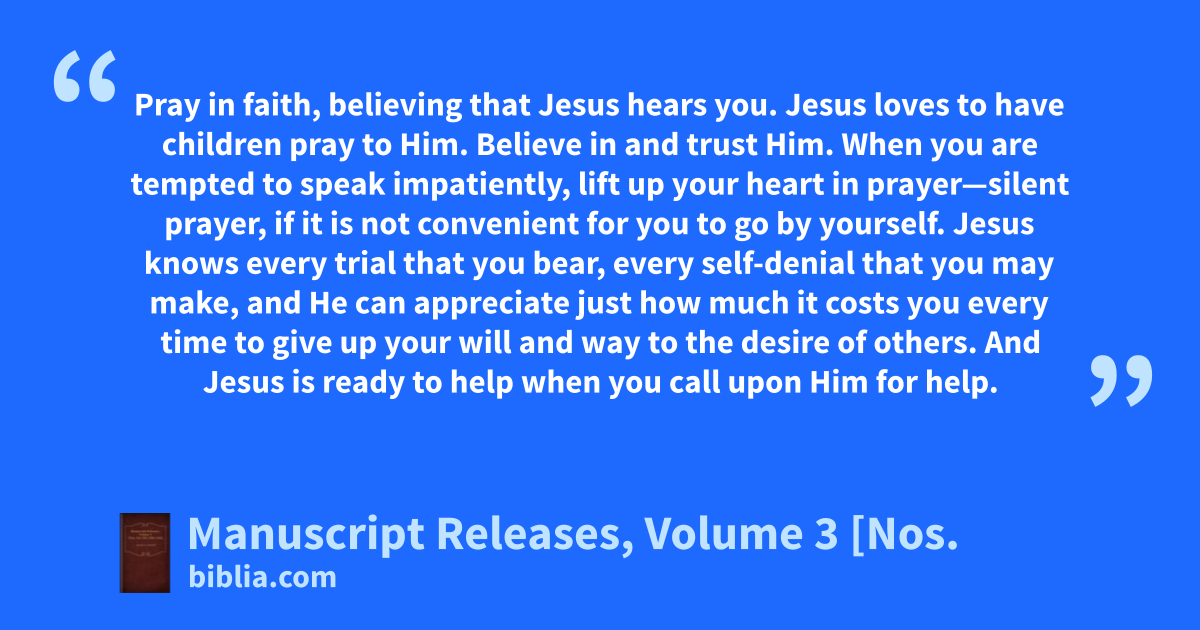 Pray in faith, believing that Jesus hears you. Jesus loves to have children pray to Him. Believe in and trust Him. When you are tempted to speak impatiently, lift up your heart in prayer—silent prayer, if it is not convenient for you to go by yourself. Jesus knows every trial that you bear, every self-denial that you may make, and He can appreciate just how much it costs you every time to give up your will and way to the desire of others. And Jesus is ready to help when you call upon Him for help.